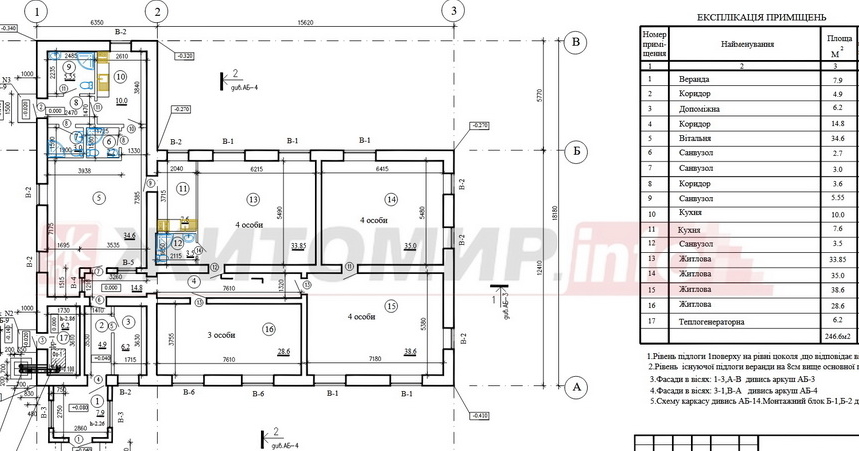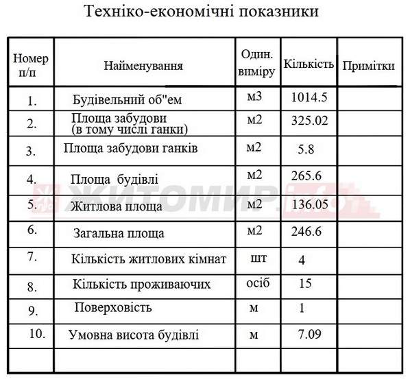 В документації до проєкту зазначено, що одноповерховий чотирикімнатний будинок має загальну площу 265,6 кв.м, житлову – 136,05 кв.м, розрахований на проживання 15 осіб.