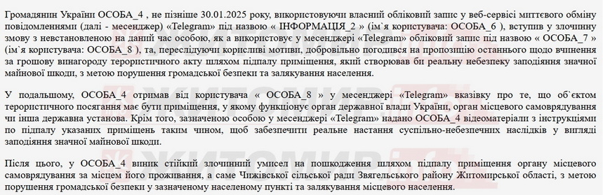 «Переслідуючи корисливі мотиви, добровільно погодився на пропозицію останнього щодо вчинення за грошову винагороду терористичного акту шляхом підпалу приміщення, який створював би реальну небезпеку заподіяння значної майнової шкоди, з метою порушення громадської безпеки та залякування населення. Надалі ОСОБА_4 (ред. обвинувачений) отримав від користувача «ОСОБА_8» у месенджері «Telegram» вказівку про те, що об`єктом терористичного посягання має бути приміщення, у якому функціонує орган державної влади України, орган місцевого самоврядування чи інша державна установа. Крім того, зазначеною особою у месенджері «Telegram» надано ОСОБА_4 відеоматеріали з інструкціями по підпалу указаних приміщень таким чином, щоб забезпечити реальне настання суспільно-небезпечних наслідків у вигляді заподіяння значної майнової шкоди», - йдеться у вироці.