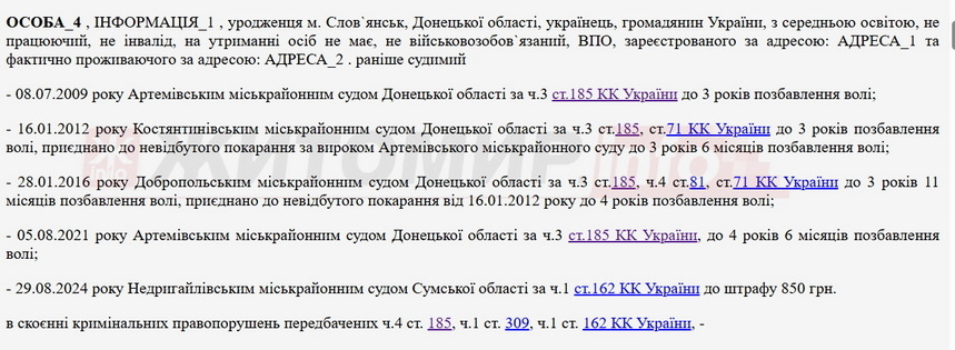 Зауважимо, у вироці Коростенського міськрайонного суду Житомирської області, який опублікований у Єдиному державному реєстрі судових рішень, йдеться про те, що чоловік мав низку судимостей.