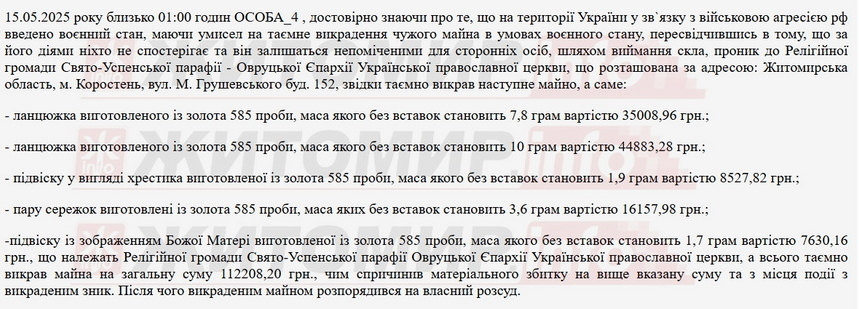 Чоловік 15 травня 2025 року обікрав релігійну громаду Свято-Успенської парафії — Овруцької Єпархії Української православної церкви (МП). Вартість вкраденого майна становила 112 208,20 грн.