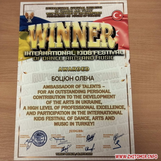 «Нещодавно дві юні житомирянки — Євгенія Троянчук (11 років) та Євангеліна Воронецька (10 років) — гідно представили Україну та наше місто Житомир на престижному фестивалі «International Kids Festival of Dance, Art and Music in Turkey 2025». Євгенія навчається вокалу у мене, а Євангеліна — учениця викладачки Олени Боцюн у Житомирській музичній школі ім. Лятошинського Житомирської Міської Ради. Обидві дівчинки привезли з Туреччини: звання лауреатів І та II ступенів та спеціальні відзнаки від членів журі та організаторів фестивалю», - йдеться у повідомленні.