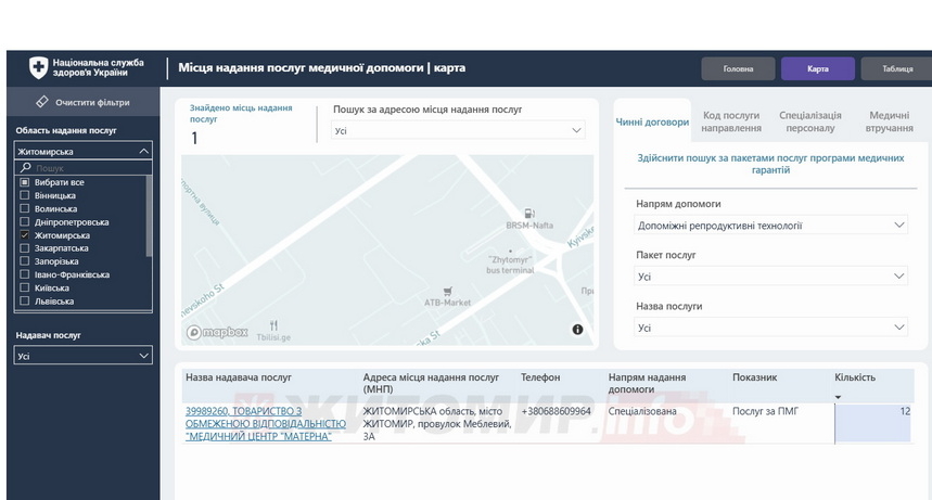 У Житомирській області участь у програмі бере ТОВ «Медичний центр «Матерна».