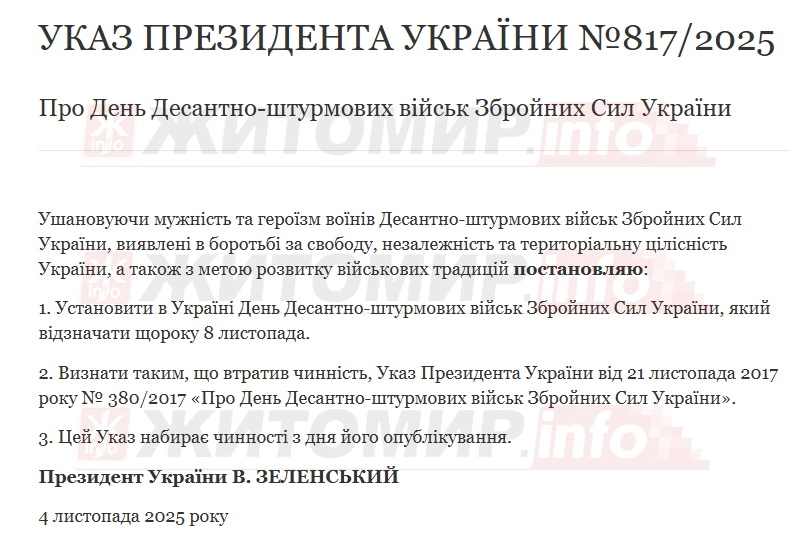 «Шановні військовослужбовці та ветерани Десантно-штурмових військ ЗС України, члени родин українських десантників. Маємо честь повідомити, що відтепер відзначаємо наше свято 8 листопада — як і має бути за новоюліанським календарем. Відповідний указ президента України Володимир Зеленський №817/2025 від 4 листопада. 8 листопада, Свято всіх ангелів Божих на чолі з Архангелом Михаїлом, невипадково є Днем ДШВ ЗСУ. Святий Михаїл — старший воєначальник небесного воїнства і покровитель військових на землі. За церковними переказами, саме він очолив усіх добрих ангелів, щоб боротися з силами, які повстали проти Бога, і переміг їх», - йдеться в повідомленні.