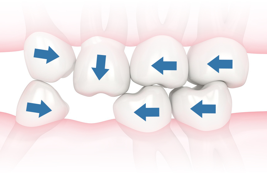 Наші зуби постійно тиснуть один на одного. Якщо 1 відсутній, то інші зміщуються в напрямку пустого місця, як доміно (зображення) - це називається ефект Попова-Годона.