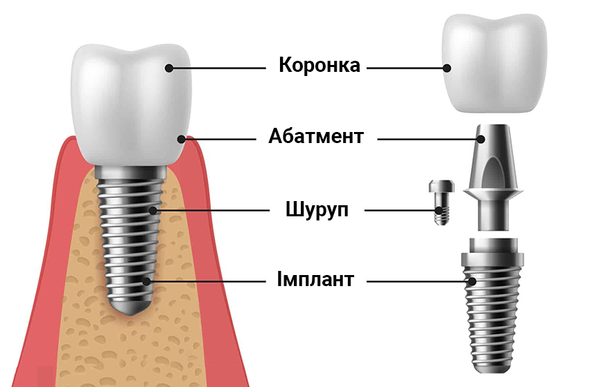 Це найкращий варіант заміни відсутнього зуба. Імплант являє собою титановий шуруп який вкручується в лунку відсутнього зуба. На імплант встановлюється коронка яка виглядає як справжній зуб.