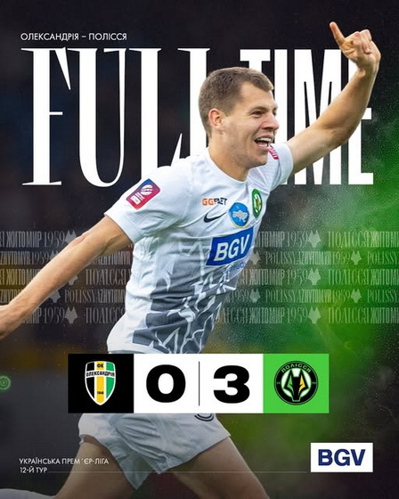 У 12 турі Української Прем’єр-ліги 9 листопада житомирське «Полісся» обіграло футбольний клуб «Олександрія» з рахунком 0:3. Матч проходив в Олександрії на КСК «Ніка».