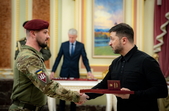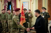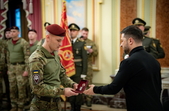 Крім того, Президент вручив бойовий прапор командиру 421-го окремого батальйону безпілотних систем «Сапсан» підполковнику Івану Левківському та стрічку почесної відзнаки «За мужність та відвагу» – командиру 78-го окремого десантно-штурмового полку полковнику Роману Євчуну.
