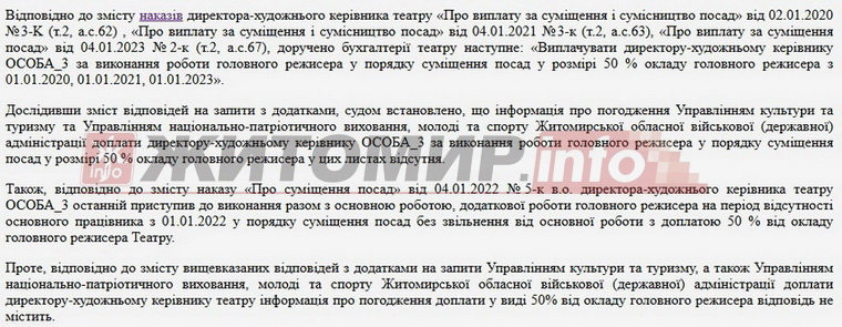 На запит суду в Управлінні культури та туризму та в Управлінні національно-патріотичного виховання, молоді та спорту Житомирської ОДА надали інформацію про виплати директору-художньому керівнику театру. Відповідно до листів, дані про погоджені доплати за виконання роботи головного режисера у порядку суміщення посад у розмірі 50% окладу головного режисера з 2020 по 2023 роки там відсутні.