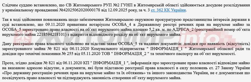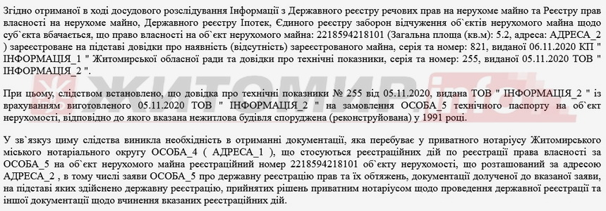 «У ході проведення досудового розслідування встановлено, що приватним нотаріусом ОСОБА_4 в Держаному реєстрі речових прав на нерухоме майно за попередньою змовою із ОСОБА_5 зареєстровано як об’єкт речових прав об’єкт нерухомості реєстраційний номер об’єкта нерухомого майна: 2218594218101 власником якої зазначено ОСОБА_5 чим здійснено несанкціоновану зміну з інформацією, яка оброблюється в електронно-обчислювальних машинах (комп’ютерах), автоматизованих системах чи комп’ютерних мережах або зберігається на носіях такої інформації, що заподіяло значну шкоду... Проте, згідно довідки № 821 від 06.11.2020 КП «ІНФОРМАЦІЯ_1», інформація про зареєстроване право власності на відповідне майно за вказаною адресою відсутня, а документи, які були підставою реєстрації права власності не є документами що посвідчують право власності чи підтверджують законність створення об`єкта нерухомого майна», - йдеться в ухвалі.