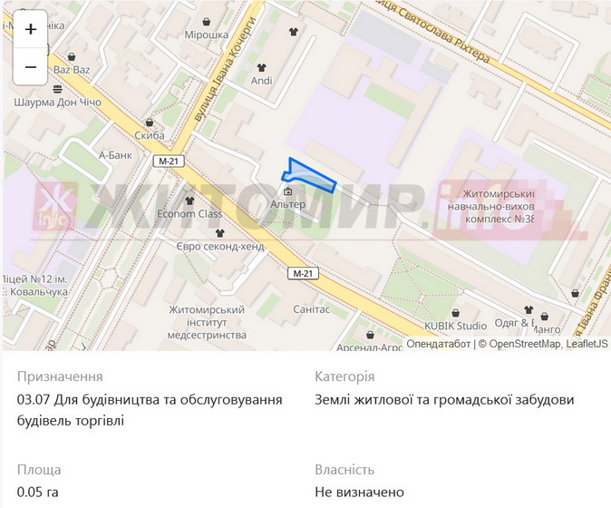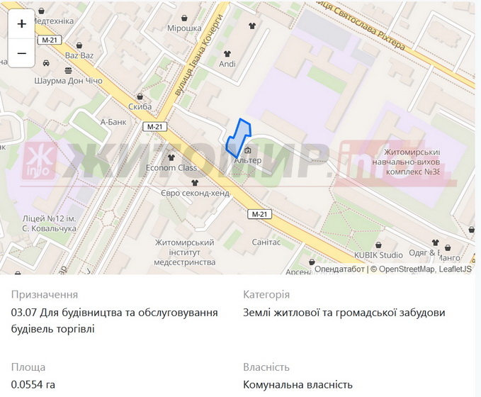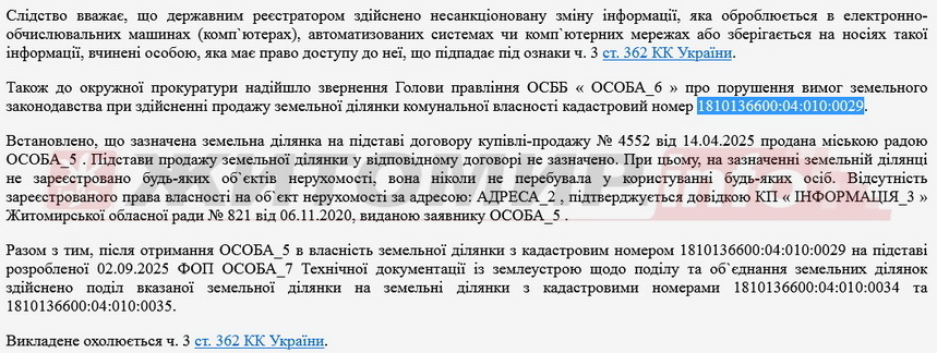 Слідчий відділ Житомирської районного управління поліції здійснює досудове розслідування у кримінальному провадженні за ознаками ч. 3 ст. 362 КК України (Несанкціоновані дії з інформацією, яка оброблюється в електронно-обчислювальних машинах (комп'ютерах), автоматизованих системах, комп'ютерних мережах або зберігається на носіях такої інформації, вчинені особою, яка має право доступу до неї), справа стосується продажу земельної ділянки у центрі Житомира площею 0,05 га, на якій бетонними блоками перегороджували проїзд.