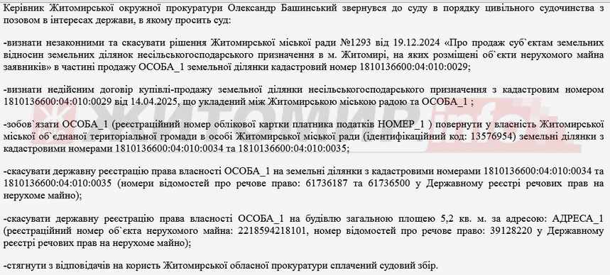 Крім того, від початку листопада на розгляді у Корольовському районному суді перебуває справа за позовом Житомирської окружної прокуратури в інтересах держави до Житомирської міської ради та Юхимчук Ніни Володимирівни про визнання незаконним та скасування рішення, визнання недійсним договору купівлі-продажу, зобов`язання повернути земельні ділянки та про скасування державної реєстрації прав.