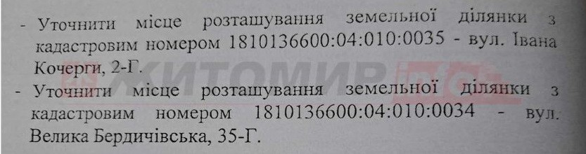 Як повідомляв Житомир.info, у вересні 2025 року мешканці будинку на вулиці Велика Бердичівська, 39 були схвильовані, що проїзд спільного користування хочуть перекрити. Дорога знаходилась на земельній ділянці 0,05 га на вул.Івана Кочерги, 2-в, яку міська рада у грудні 2024 року продала Юхимчук Ніні Володимирівні: питання внесли до проєкту рішення сесії за рекомендацією погоджувальної ради та земельної комісії.
