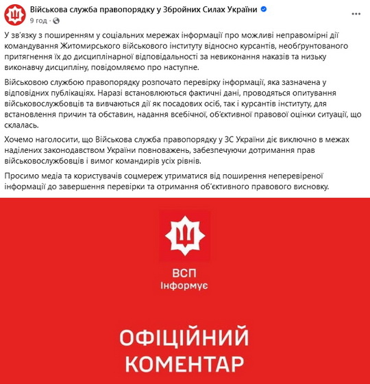 «У зв’язку з поширенням у соціальних мережах інформації про можливі неправомірні дії командування Житомирського військового інституту відносно курсантів, необґрунтованого притягнення їх до дисциплінарної відповідальності за невиконання наказів та низьку виконавчу дисципліну, повідомляємо про наступне. Військовою службою правопорядку розпочато перевірку інформації, яка зазначена у відповідних публікаціях. Наразі встановлюються фактичні дані, проводяться опитування військовослужбовців та вивчаються дії як посадових осіб, так і курсантів інституту, для встановлення причин та обставин, надання всебічної, об’єктивної правової оцінки ситуації, що склалась», - йдеться у повідомленні.