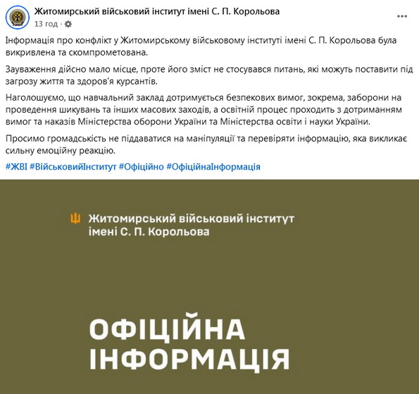 «Інформація про конфлікт у Житомирському військовому інституті імені С. П. Корольова була викривлена та скомпрометована. Зауваження дійсно мало місце, проте його зміст не стосувався питань, які можуть поставити під загрозу життя та здоров'я курсантів. Наголошуємо, що навчальний заклад дотримується безпекових вимог, зокрема, заборони на проведення шикувань та інших масових заходів, а освітній процес проходить з дотриманням вимог та наказів Міністерства оборони України та Міністерства освіти і науки України. Просимо громадськість не піддаватися на маніпуляції та перевіряти інформацію, яка викликає сильну емоційну реакцію», - зазначається у повідомленні.