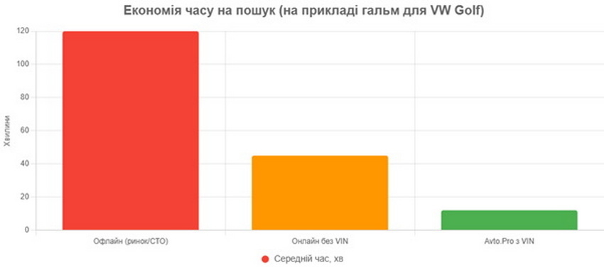 Час пошуку запчастин онлайн vs офлайн (симуляція 2025, дані RACE/Avto.Pro)