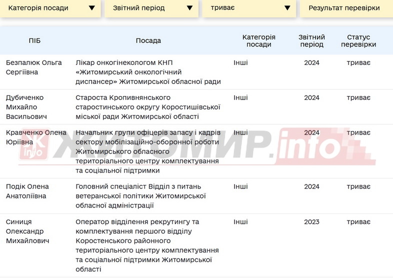 Національне агентство з питань запобігання корупції почало перевірку декларацій двох співробітників ТЦК та СП: начальник групи офіцерів запасу і кадрів сектору мобілізаційно-оборонної роботи Житомирського обласного територіального центру комплектування Олени Кравченко та оператора відділення рекрутингу та комплектування першого відділу Коростенського районного територіального центру комплектування Олександра Синиці.