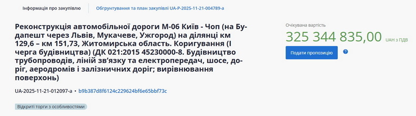 «Для завершення реконструкції дороги М-06 Київ – Чоп на ділянці км 129,6 - км 151,73 Служба відновлення у Житомирській області сьогодні оголосила державну закупівлю робіт. Кінцевий строк подання тендерних пропозицій - 11 грудня 2025. Очікувана вартість - 325 344 835,00 грн з ПДВ», - йдеться у повідомленні.