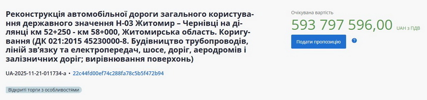 «Оголошено торги на реконструкцію автошляху державного значення Н-03 Житомир – Чернівці на ділянці км 52+250 – км 58+000, що на території Вільшанської ОТГ Житомирського району. Кінцевий строк подання тендерних пропозицій - 8 грудня. Очікувана вартість – 593 млн 797 тис. грн. Загальна протяжність ділянки – 5750 м. Тривалість будівництва - 17 місяців (ред. до 30 червня 2027 року)», - йдеться у повідомленні.