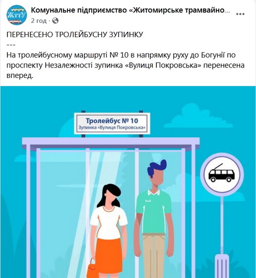 Зауважимо, що 26 листопада Житомирське ТТУ повідомило про перенесення вперед, в напрямку Богунії, тролейбусної зупинки «Вулиця Покровська» на проспекті Незалежності.