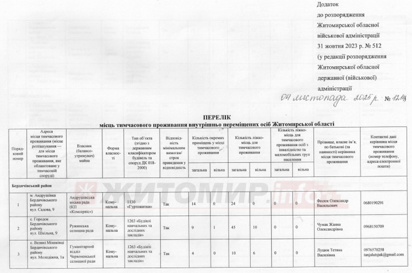 «Відповідно до законів України «Про місцеві державні адміністрації», «Про правовий режим воєнного стану», указів Президента України від 24 лютого 2022 року № 64/2022 «Про введення воєнного стану в Україні», від 24 лютого 2022 року № 68/2022 «Про утворення військових адміністрацій», розпорядження Кабінету Міністрів України від 07 квітня 2023 року № 312-р «Про схвалення Стратегії державної політики щодо внутрішнього переміщення на період до 2025 року та затвердження операційного плану заходів з її реалізації у 2023-2025 роках», постанови Кабінету Міністрів України від 01 вересня 2023 року № 930 «Деякі питання функціонування місць тимчасового проживання внутрішньо переміщених осіб», з метою здійснення загальної координації діяльності з утворення місць тимчасового проживання та забезпечення мінімально необхідних вимог у таких місцях для життєзабезпечення внутрішньо переміщених осіб, враховуючи листи Семенівської сільської ради від 24.10.2025 № 637, Райгородоцької сільської ради від 24.10.2025 № 1175, Житомирського фахового коледжу культури і мистецтв імені Івана Огієнка Житомирської обласної ради зобов’язую: унести до розпорядження обласної військової адміністрації від 31.10.2023 № 512 «Про затвердження переліку місць тимчасового проживання в Житомирській області» такі зміни: затвердити перелік місць тимчасового проживання внутрішньо переміщених осіб Житомирської області у новій редакції, що додається», - йдеться у повідомленні.