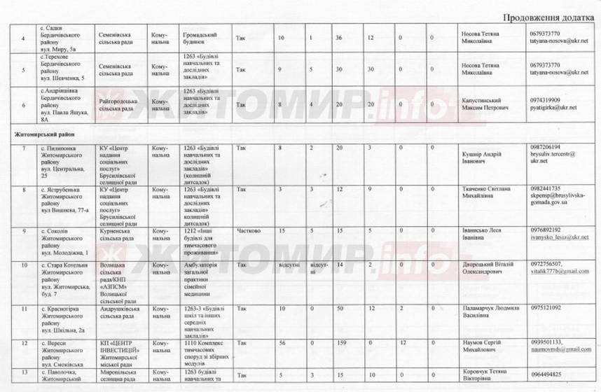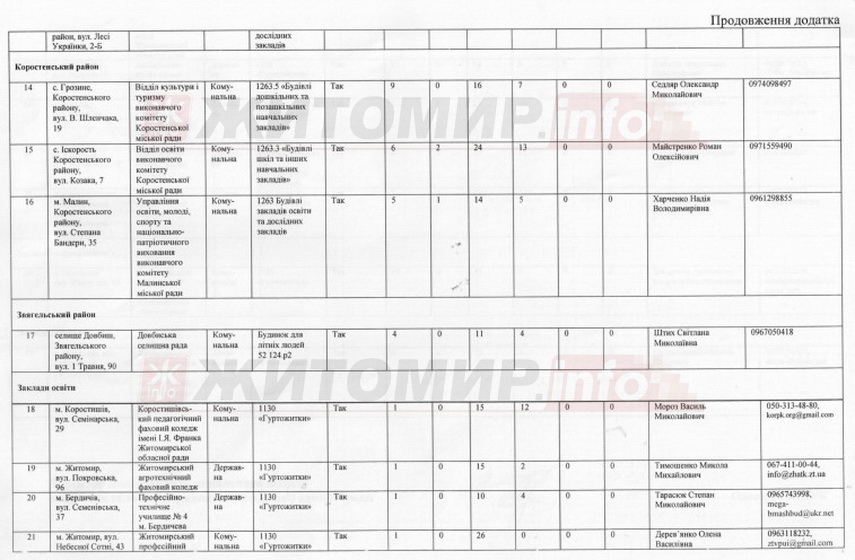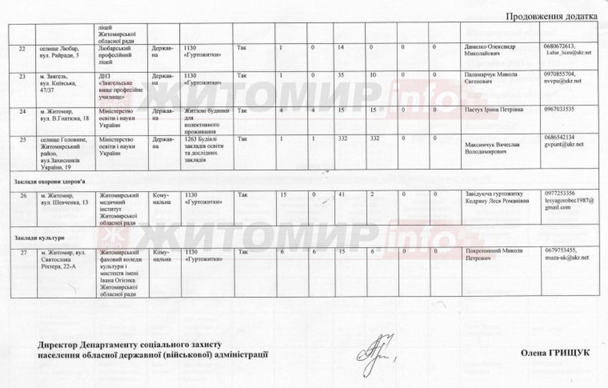 Зауважимо, у додатку до розпорядження вказано, що у Житомирській області функціонує 27 місць тимчасового проживання ВПО. Зокрема, у Бердичівському районі їх облаштовано 7, у Житомирському – 15, у Коростенському – 3, а у Звягельському – 2. З них на базі закладів освіти облаштовано 8 МТП, а також по одному на базі закладів здоров’я та закладів культури.