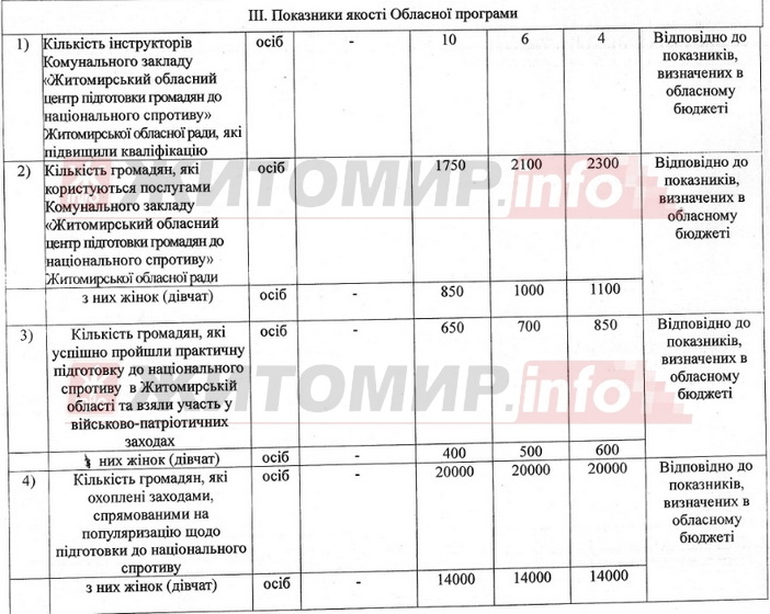 Зауважимо, що у програмі зазначена кількість громадян, які успішно пройдуть підготовку до національного спротиву – 2200 осіб за три роки, Також вказана кількість громадян, охоплених заходами популяризації підготовки до національного спротиву – по 20 тисяч кожного року.