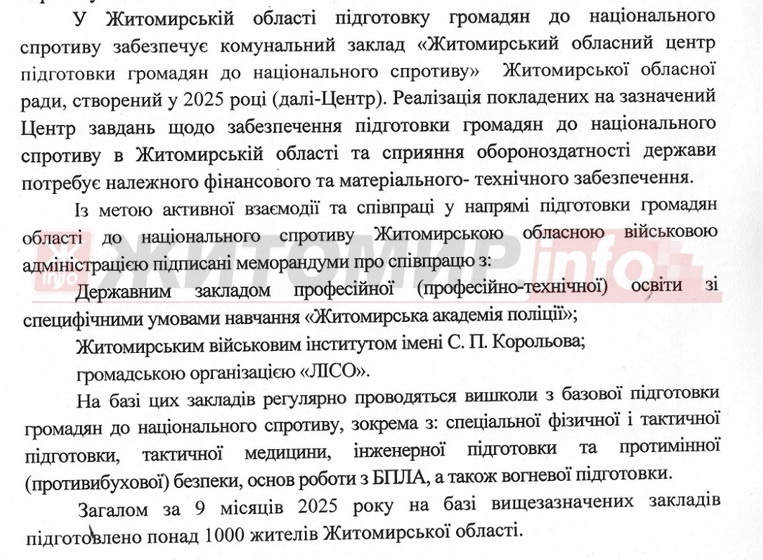 Відповідальні виконавці обласної програми – управління національно-патріотичного виховання, молоді та спорту ОДА і комунальний заклад «Житомирський обласний центр підготовки громадян до національного спротиву» Житомирської обласної ради. Зазначається, що за 9 місяців 2025 року підготовку до національного спротиву пройшли 1000 жителів Житомирської області.