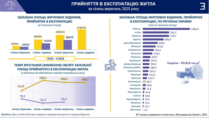 У січні-вересні 2025 року в області прийнято в експлуатацію 86,5 тис.кв.м загальної площі нового житла, що на 33,6% менше, ніж за 9 місяців минулого року.