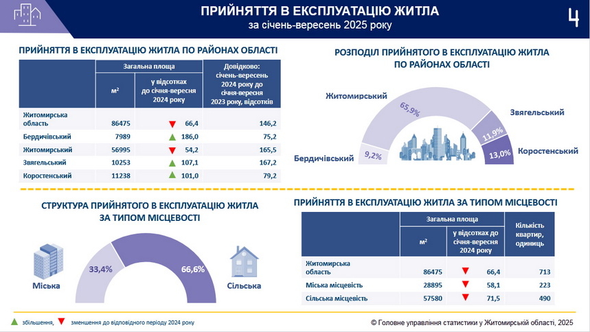 «У Житомирському районі побудовано 65,9% усього житла, Коростенському – 13,0%, Звягельському – 11,9%, Бердичівському – 9,2%. У сільській місцевості прийнято в експлуатацію дві третини загальної площі житла (57,6 тис.кв.м), що на 28,5% менше, ніж у січні-вересні 2024 року. Обсяг житлового будівництва у міській місцевості зменшився на 41,9% та становив 28,9 тис.кв.м загальної площі», - йдеться у повідомленні.