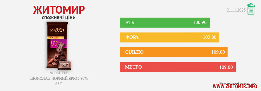 Моніторинг здійснено на основі інформації, отриманої за методом контрольної закупки 21.11.2025 р. у місцях продажу: АТБ, пр. Миру, 15а, Фора, вул. Київська, 106, Метро, вул. Ватутіна, 55в, Сільпо, вул. Житній ринок, 1