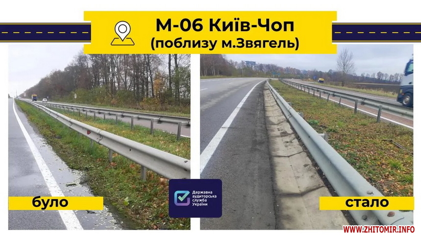 «До Державної аудиторської служби України надходили численні звернення з проханням перевірити аварійно небезпечну ділянку міжнародної траси М-06 (Київ-Чоп) на окружній міста Звягель, де часто трапляються дорожньо-транспортні пригоди. Під час проведення ревізії окремих питань фінансово-господарської діяльності Служби відновлення та розвитку інфраструктури у Житомирській області працівники Держаудитслужби обстежили вказане місце на трасі біля Звягеля. Фахівці Держаудитслужби виявили низку критичних недоліків: були відсутні напрямні стовпчики, огородження та попереджувальні знаки; засмічені водовідвідні лотки та водоприймачі; захаращені смуги відводу та укоси; накопичення ґрунту під бар’єрним огородженням. У зв’язку з чим на проїжджій частині затримувалася та збиралася вода, що і могло стати причиною підвищеної аварійності. Таким чином, ревізори наочно переконалися в тому, що балансоутримувач та виконавець експлуатаційного утримання вказаної ділянки дороги дійсно неналежно виконували свої обов’язки», - йдеться у повідомленні.