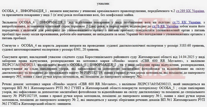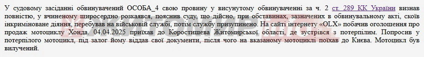 «Суд установив, що ОСОБА_4, будучи військовослужбовцем військової служби за контрактом, 03 квітня 2025 року близько 09 години переглядаючи у мережі Інтернет інтернет-платформу «OLX» знайшов оголошення про продаж мотоцикла марки «Honda» моделі «CBR 600 RR Movaster». В цей момент в останнього виник злочинний умисел направлений на незаконне заволодіння даним транспортним засобом шляхом обману. З метою реалізації свого злочинного умислу … домовився про зустріч, з метою нібито придбання даного мотоцикла. При цьому, в ході даної розмови вони обумовили час та місце такої зустрічі, а саме 04.04.2025 близько 13 години, на автовокзалі м. Коростишів, що за адресою: вул. Київська, 34 Житомирського району Житомирської області. У подальшому, продовжуючи реалізацію свого злочинного умислу, направленого на незаконне заволодіння транспортним засобом шляхом обману, 04.04.2025, близько 13 години 40 хвилин, перебуваючи на автовокзалі по вул. Київська, неподалік буд. № 34 в м. Коростишів Житомирського району Житомирської області, ОСОБА_4 зустрівся з потерпілим ОСОБА_5, де під час розмови з останнім, з метою нібито перевірки справності мотоцикла марки «Honda» моделі «CBR 600 RR Movaster», попросив проїхатися на ньому по м. Коростишів Житомирського району Житомирської області, на що потерпілий ОСОБА_5, будучи введеним в оману, погодився та надав останньому таку можливість», - йдеться у матеріалах суду.