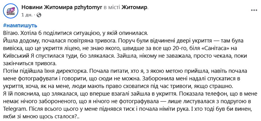 У соціальних мережах ширився допис про те, що під час повітряної тривоги жінці не дали можливості перебувати в укритті, розташованому в районі вул. Київської в обласному центрі. Поліцейські Житомирського райуправління №2 розпочали перевірку.