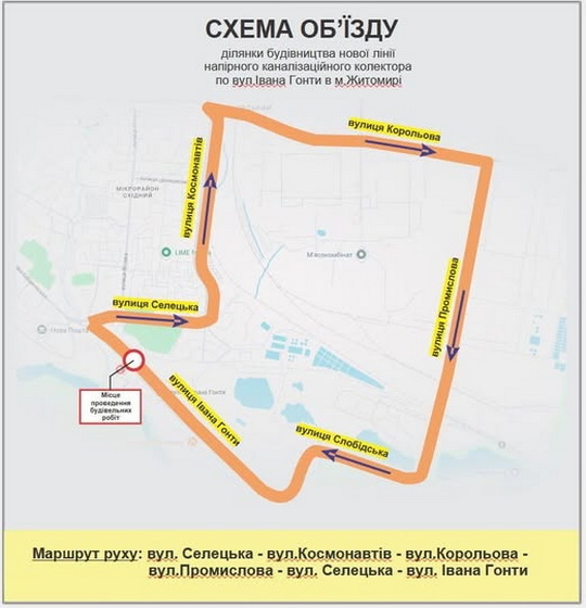 У Житомирі з 6 по 8 грудня включно зміниться маршрут руху транспорту по вул. І. Гонти через те, що підрядники виконуватимуть роботи зі з’єднання двох частин нового колектора.