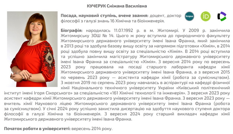 Кучерук Сніжані Василівні – доктору філософії з галузі Хімічна та біоінженерія, старшому викладачу кафедри Житомирського державного університету імені Івана Франка МОН України присуджена премія за роботу «Альтернативні способи переробки ільменітової руди та визначення фізико-хімічних властивостей одержаних продуктів».