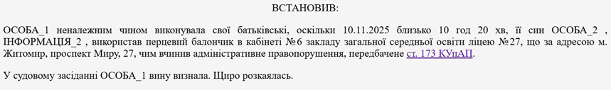 «ОСОБА_1 неналежним чином виконувала свої батьківські обов’язки, оскільки 10.11.2025 близько 10 год 20 хв, її син (…), використав перцевий балончик в кабінеті №6 закладу загальної середньої освіти ліцею №27, що за адресою м. Житомир, проспект Миру, 27», – йдеться у постанові, ухваленій 20 листопада.