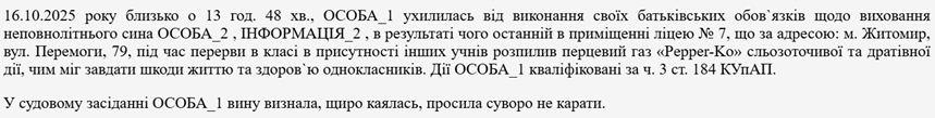«16.10.2025 року близько о 13 год 48 хв ОСОБА_1 ухилилась від виконання своїх батьківських обов`язків щодо виховання неповнолітнього сина (…), в результаті чого останній в приміщенні ліцею № 7, що за адресою: м. Житомир, вул. Перемоги, 79, під час перерви в класі в присутності інших учнів розпилив перцевий газ «Pepper-Ko» сльозоточивої та дратівної дії, чим міг завдати шкоди життю та здоров`ю однокласників», – йдеться у матеріалах суду.