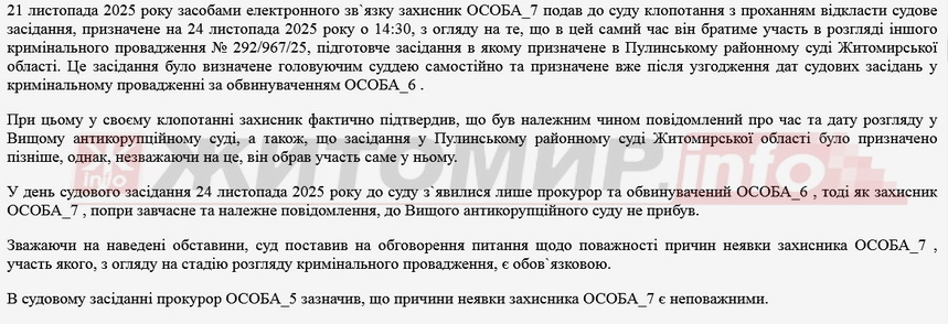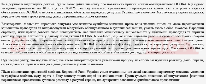 «З метою забезпечення ефективного розгляду справи колегія суддів заздалегідь погоджує дати судових засідань з учасниками процесу. Одне з таких засідань було призначено на 29 жовтня 2025 року на 10 годину 30 хвилин. Разом з тим, 28 жовтня 2025 року захисник обвинуваченого ОСОБА_6 – адвокат ОСОБА_7 подав до суду клопотання про відкладення зазначеного судового засідання, посилаючись на неможливість прибуття обвинуваченого ОСОБА_6 до суду, у зв`язку із необхідністю йому як члену Комітету Верховної Ради України з питань здоров`я нації, медичної допомоги та медичного страхування, голові підкомітету з питань фармації та фармацевтичної діяльності цього Комітету, обов`язково бути присутнім на засіданні Комітету, проведення якого заплановано на 29 жовтня 2025 року на 11:00 год. В судовому засіданні прокурор Спеціалізованої антикорупційної прокуратури ОСОБА_5 просив визнати причини неявки в судове засідання обвинуваченого ОСОБА_6 неповажними та просив накласти на останнього грошове стягнення у вигляді 2 прожиткових мінімумів для працездатних осіб», - йдеться в ухвалі суду.