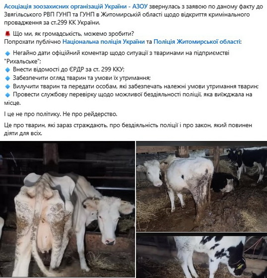 Зауважимо, днями у мережі пошився допис президентки Асоціації зоозахисних організацій України Марини Суркової, у якому вона повідомила, що її організація звернулась із заявою до поліції щодо відкриття кримінального провадження за фактом жорстокого поводження з тваринами на підприємстві «Рихальське», а також прикріпила фото корів.