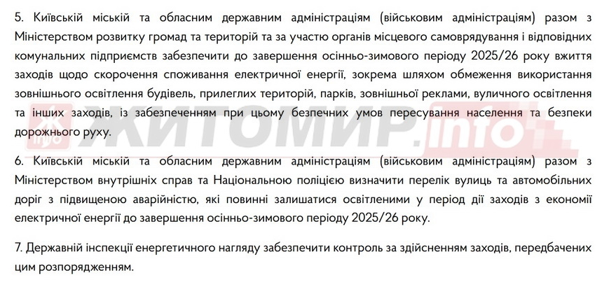 При цьому вулиці та дороги з підвищеною аварійністю повинні залишатися освітленими навіть в умовах економії електричної енергії. Перелік таких ділянок визначать МВС та Національна поліція.