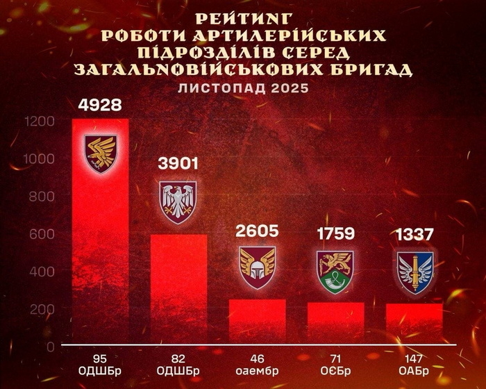 «Артилеристи 95 бригади ДШВ знову — перші в рейтингу найефективніших ЗСУ. У листопаді наші боги війни знищили стільки ворога та його техніки, що впевнено посіли 1 місце серед підрозділів. Приємно, що топ-5 найкращих вибороли артилеристи наших братніх бригад із сім’ї ДШВ», - йдеться в повідомленні.