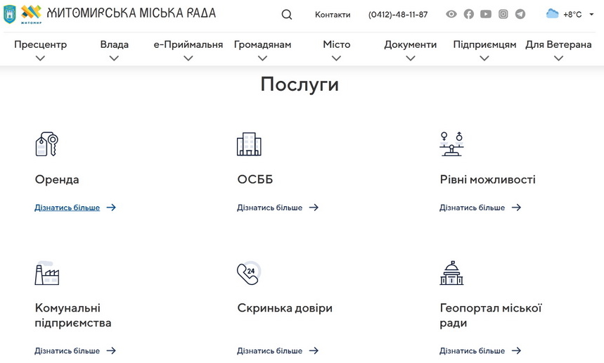 На офіційному сайті Житомирської міської ради є окремий розділ про оренду, дістатися до нього можна трьома способами: у переліку «Послуги» знизу сайту, в розділах «Громадянам» і «Підприємцям» через підрозділ «Комунальне майно та земельні ресурси».