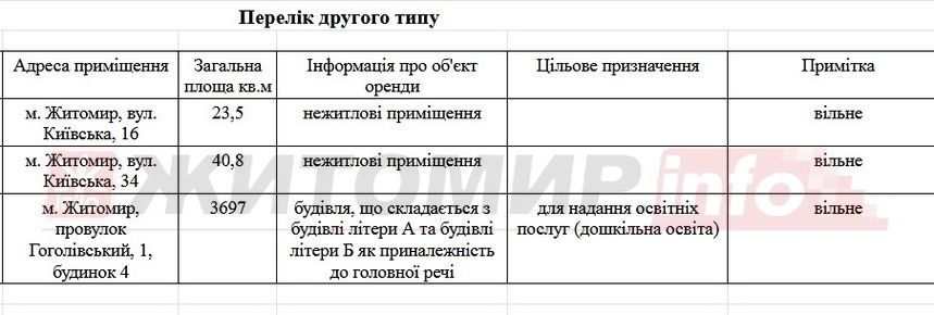 На сайті міської ради крім об’єктів оренди першого типу є також перелік другого типу, в якому є три приміщення: