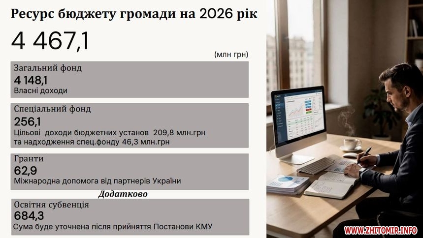 Як повідомляв Житомир.info, 9 грудня 2025 року у міській раді оприлюднили проєкт бюджету Житомирської міської громади на 2026 рік з доходами 4,47 млрд грн й видатками 4,62 млрд грн. Сесія, на якій будуть затверджувати бюджет громади, запланована на 18 грудня.