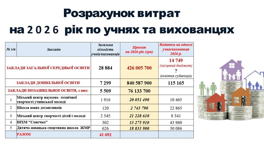 «Тільки з загального фонду, коштом власного ресурсу, спрямовано 1 555,1 млн грн, при надходженні субвенції з державного бюджету ця сума буде більше ніж 2 млрд грн. Дуже цікава, та можна сказати негативна динаміка, те що в нас зменшується кількість дітей, тому витрати на одного учня у нас зростають. Якщо ми говоримо про школи, без освітньої субвенції, це становить 14 тис. 749 грн на одного учня в рік. Якщо говорити про заклади дошкільної освіти, то річні витрати становлять 15 тис. грн на одну дитину. Ця сума зростає внаслідок того, що кількість дітей зменшується, відповідно зарплата та енергоносії зростають», – зазначила Діна Прохорчук.