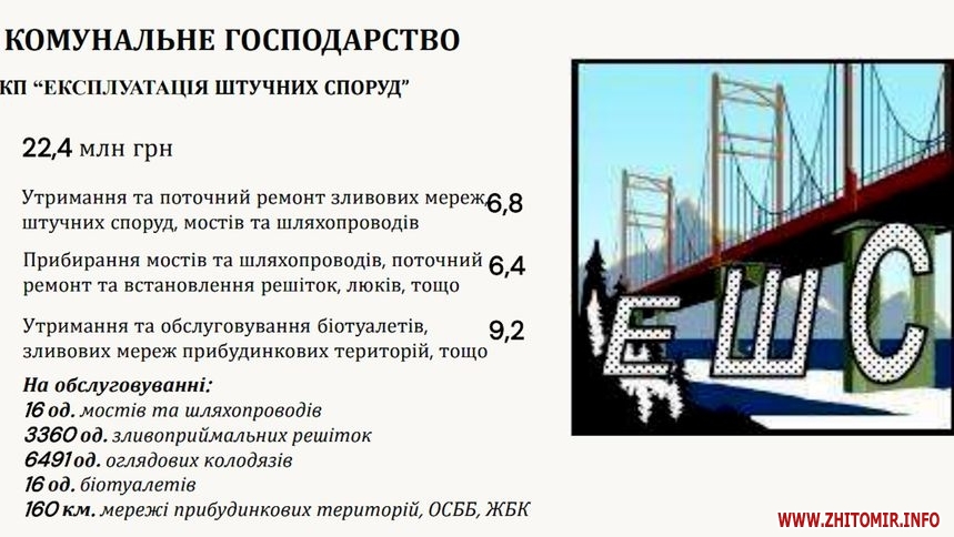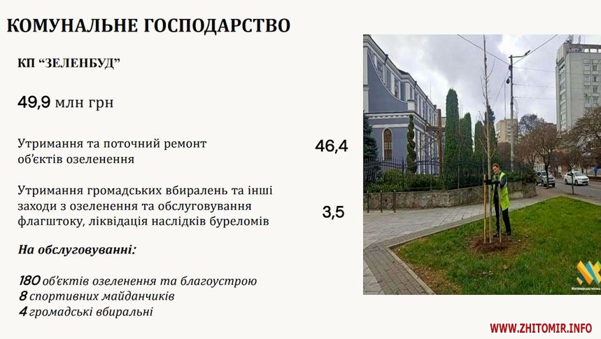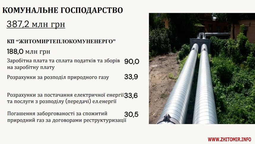 «КП «Житомиртеплокомуненерго» – 188 млн грн, з них, внаслідок не підвищення тарифу, спрямовуються на розрахунки по заробітній платі, за розподіл природного газу, постачання електроенергії на загальну суму – 188 млн грн. На КП «Житомирводоканал», із загального фонду спрямовується 55 млн грн. По КП «Зеленбуд» на утримання об'єктів озеленення передбачана сума – 50 млн грн. На КП «Міськсвітло» спрямовуємо майже 39 млн грн, забезпечується енергія для зовнішнього освітлення міста на 20,5 млн, а також поточний ремонт та утримання мереж електропостачання на 18,2 млн грн. По КП «Спеціалізований комбінат комунально-побутового обслуговування» – 20,1 млн передбачено на утримання кладовищ, 8,6 млн грн на поточний ремонт кладовищ», – додає Діна Прохорчук.