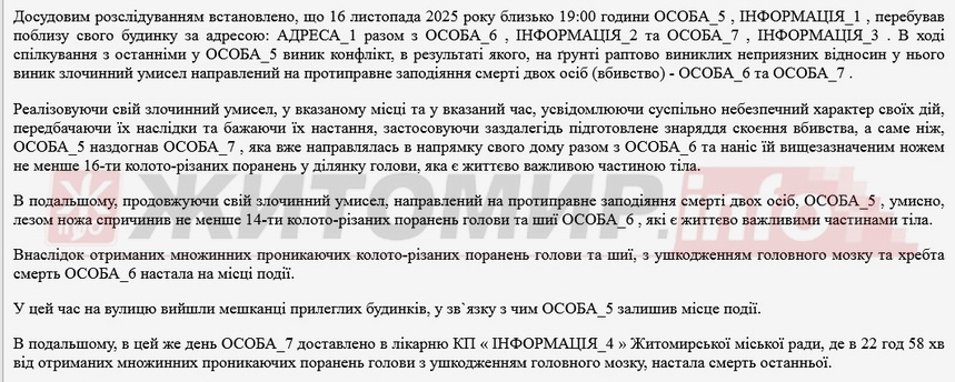 «Слідчий звернувся до суду із вказаним клопотаннями в обґрунтування якого зазначив, що слідчим управлінням Головного управляння Національної поліції в Житомирській області проводиться досудове розслідування у кримінальному провадженні відомості про яке внесені до Єдиного реєстру досудових розслідувань від 16.11.2025 року за ознаками кримінального правопорушення, передбаченого п. 1 ч. 2 ст. 115 КК України. Досудовим розслідуванням встановлено, що 16 листопада 2025 року близько 19:00 години ОСОБА_5, перебував поблизу свого будинку разом з ОСОБА_6 та ОСОБА_7. В ході спілкування з останніми у ОСОБА_5 виник конфлікт, в результаті якого, на ґрунті раптово виниклих неприязних відносин у нього виник злочинний умисел направлений на протиправне заподіяння смерті двох осіб (вбивство)», - йдеться в ухвалі.