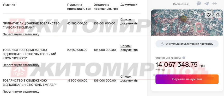 Нагадаємо, в жовтні цього року Житомирська міська рада ухвалила рішення про затвердження експертної грошової оцінки земельної ділянки на Старому бульварі та проведення земельних торгів, а перша заступниця мера Житомира Світлана Ольшанська пояснила, що такі об’єкти виставляють на аукціон лише коли є заява від потенційного покупця – у квітні цього року міська рада отримала таку заявку від ФК «Полісся».