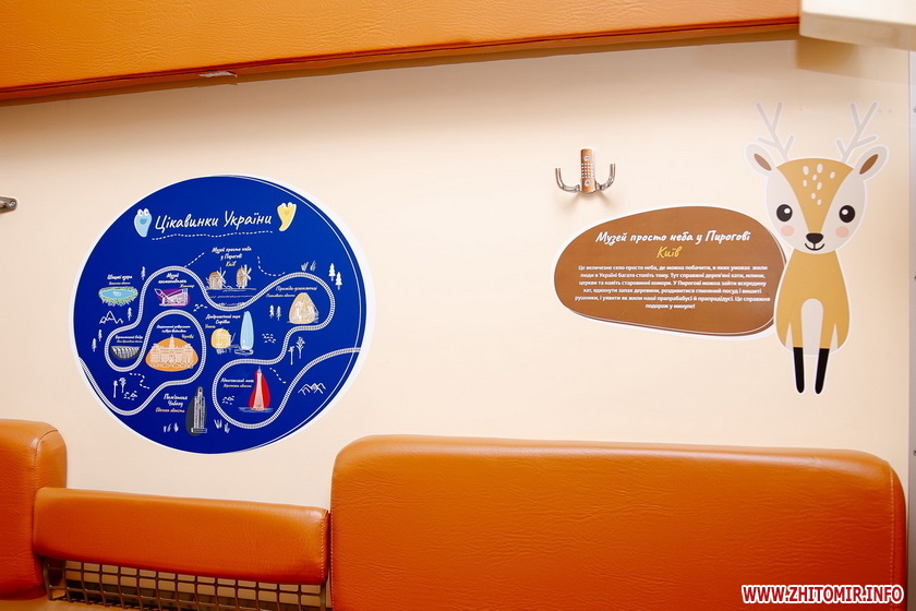 Ці вагони відрізняються від інших дитячих унікальним дизайном купе — кожне з них присвячено унікальному місцю в Україні. Яскраві картинки розповідають його історію та знайомлять з тваринами й рослинами, що там знаходяться. Наприклад, з крабиками, які живуть коло Аджигольського маяка на Херсонщині. Кажуть, що саме вони доглядають за ним.
