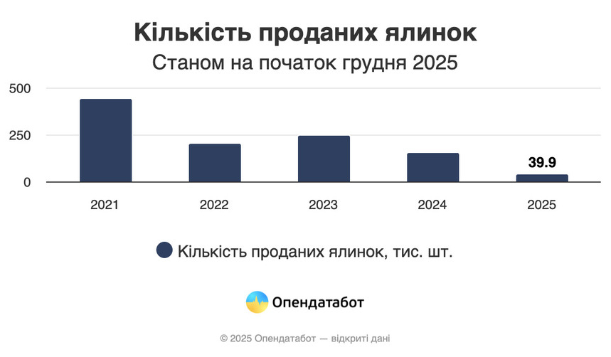 Діаграма «Кількість проданих ялинок станом на початок грудня 2025 року», Opendatabot